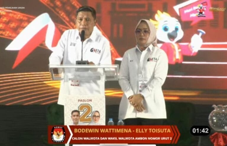 AMBON, LaskarMaluku.com – Pasangan calon Pilkada Kota Ambon nomor 2 Bodewin Wattimena-Elly Toisuta tampil memukau di debat kedua Calon Walikota dan Wakil Walikota Ambon Tahun 2024, yang digelar KPU Kota Ambon di gedung Islamic Center, Selasa (5/11/2024).