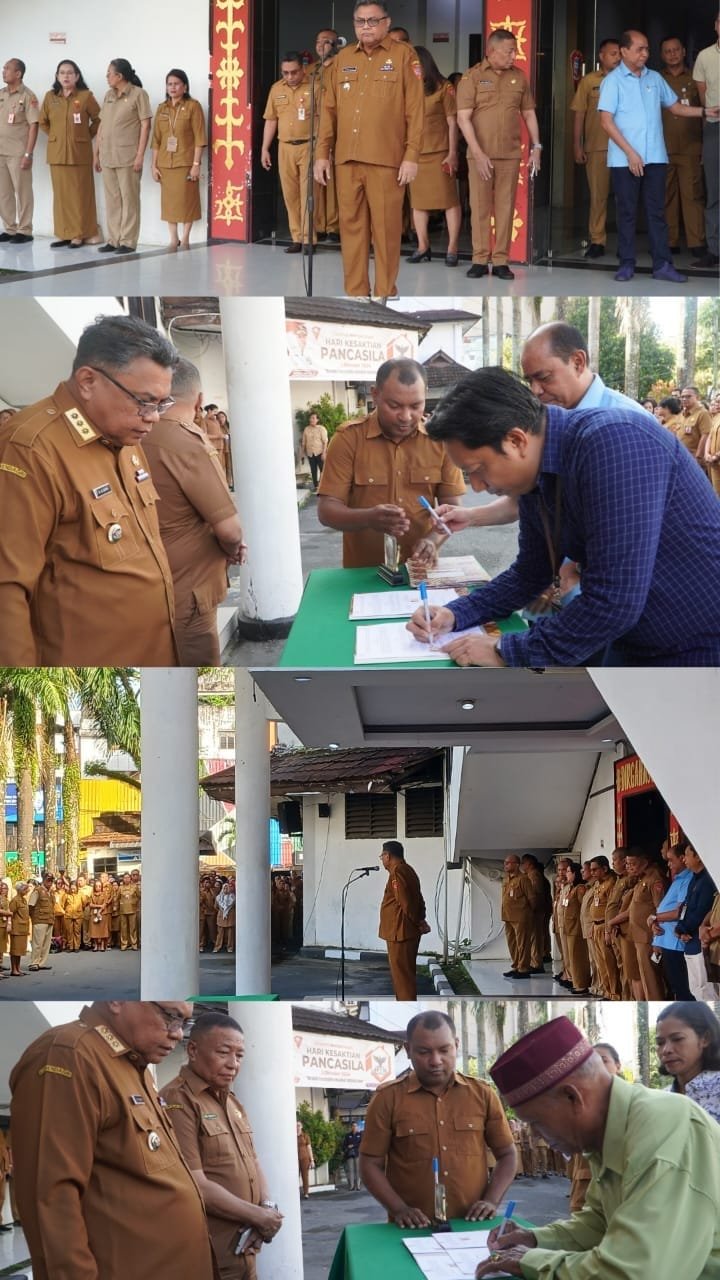 Proses penandatanganan MoU antara Pelindo Cabang Ambon dengan Pemerintah Kota Ambon berlangsung di Halaman parkir Balai Kota Ambon di sela-sela apel rutin pegawai Pemkot Ambon, Senin (14/10/2024).