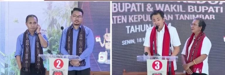 SAUMLAKI, LaskarMaluku.com – Calon Bupati Kepulauan Tanimbar nomor urut 3 Ricky Jawerissa sedikit grogi ketika menjawab pertanyaan dari Calon Wakil Bupati nomor urut 2 Kevin Keliduan saat debat pasangan calon kedua yang digelar KPU Kabupaten Kepulauan Tanimbar di Saumlaki, Senin (18/11/2024) dan disiarkan langsung di TVOne.