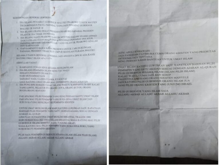 “Lihatlah di Palestina umat Muslim dibantai, tragedi 1999 kerusuhan Maluku umat Islam dibantai masa katong mau pilih gubernur orang Kristen yang junjung Israel. Masa katong pilih pemimpin yang suka hina suku, yang suruh ikuti pemimpin Kristen,” tulis isi selebaran.