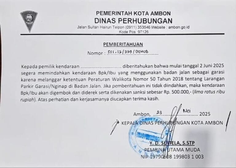 AMBON, LaskarMaluku.com – Pemerintah Kota (Pemkot) Ambon melalui Dinas Perhubungan (Dishub) akan melakukan penertiban terhadap kendaraan bermotor roda empat dan roda enam yang memanfaatkan badan jalan sebagai garasi.Penertiban akan dilaksanakan 2 Juni 2025 mendatang.