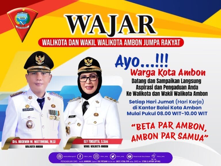 “Jadi setiap Jumat pagi pukul 08.00 WIT sampai 10.00 WIT bertempat di pelataran depan Balai Kota, masyarakat dapat datang mengutarakan persoalannya untuk ditangani secara langsung oleh Walikota Ambon, Bodewin M. Wattimena bersama Wawali, Ely Toisuta, serta seluruh pimpinan OPD,” ungkapnya.