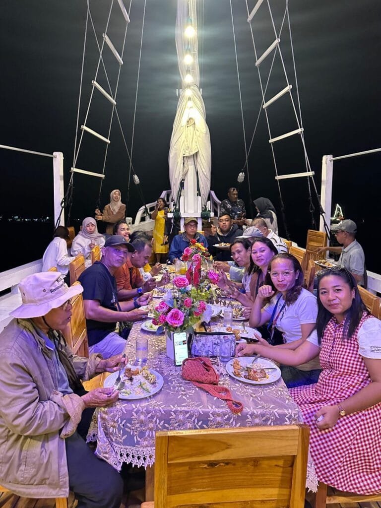 Dengan alunan musik dan pemandangan laut yang menawan, para peserta menikmati suasana malam di atas kapal Phinisi KLM Ghinayah.