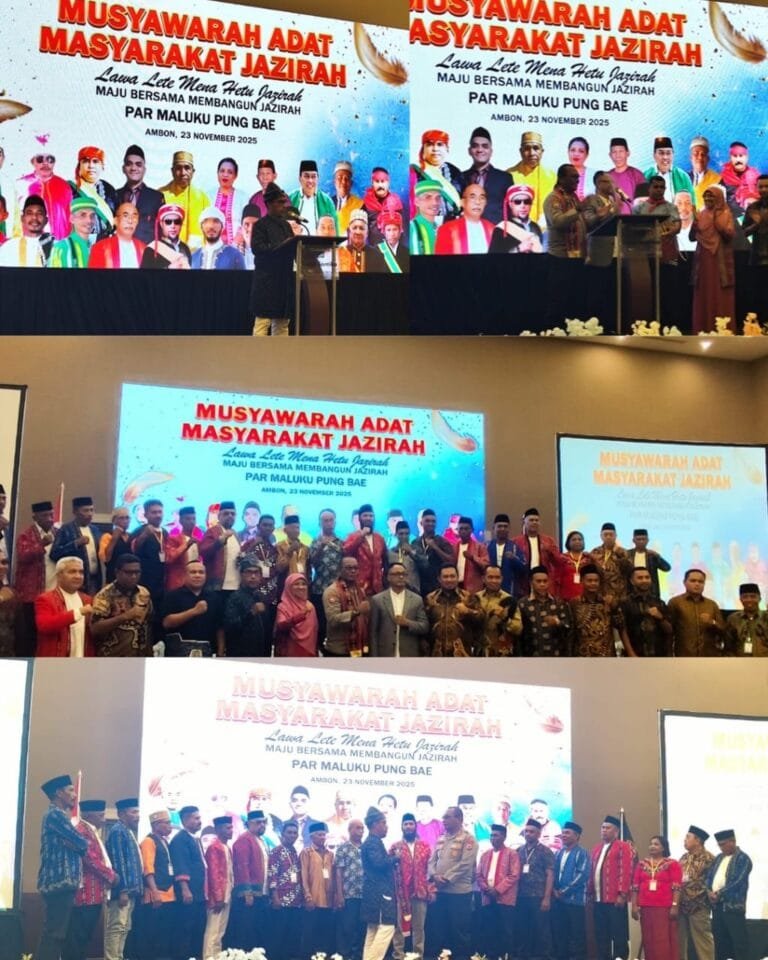AMBON,LaskarMaluku.com— Kekuatan adat dan persaudaraan masyarakat Jazirah kembali diteguhkan lewat Musyawarah Adat Hetu Jazirah bertema “Lawa Lete Mena Hetu Jazirah – Maju Berama Membangun Jazirah par Maluku pung Bae”, yang berlangsung di Hotel Santika Ambon, Minggu (23/11/25).