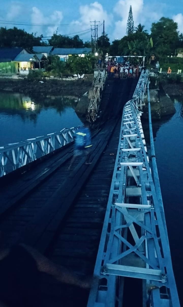 “Ada ibu-ibu dalam mobil mau jualan ke pasar. Ketika melintas di pertengahan jembatan, langsung patah (ambruk). Beruntung supir segera menginjak rem mobil dan tidak ikut ambruk dengan jembatan ke laut, ” tutur Rensa saat dihubungi media ini, Selasa (11/3/2025).