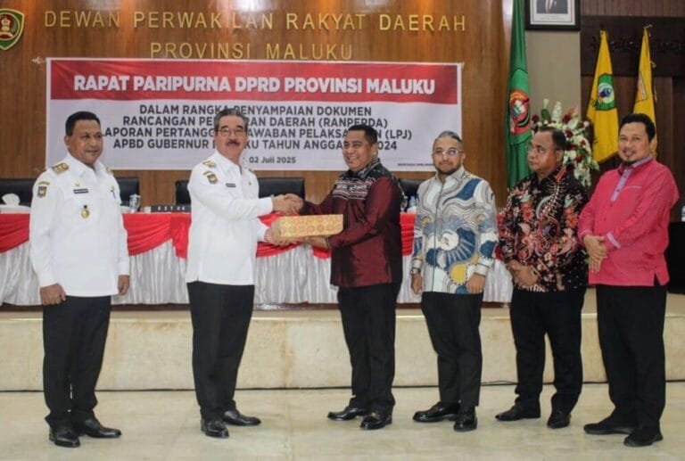 AMBON, LaskarMaluku.com — Gubernur Maluku Hendrik Lewerissa menyampaikan Dokumen Rancangan Peraturan Daerah (RANPERDA) Laporan Pertanggungjawaban (LPJ) Pelaksanaan APBD Provinsi Maluku Tahun Anggaran 2024, kepada Ketua DPRD Provinsi Maluku Benhur G. Watubun, dalam Rapat Paripurna DPRD Provinsi Maluku.