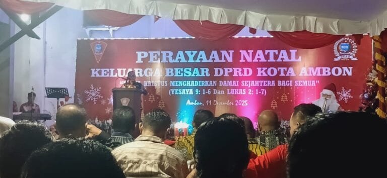 AMBON, LaskarMaluku.com – Ketua DPRD Kota Ambon, Morits Tamaela, menyampaikan rasa syukur dan sukacita atas kehadiran lengkap pimpinan daerah dalam ibadah perayaan Natal DPRD. Ia mengajak seluruh anggota legislatif memaknai Natal sebagai momentum menghadirkan damai sejahtera bagi semua.
