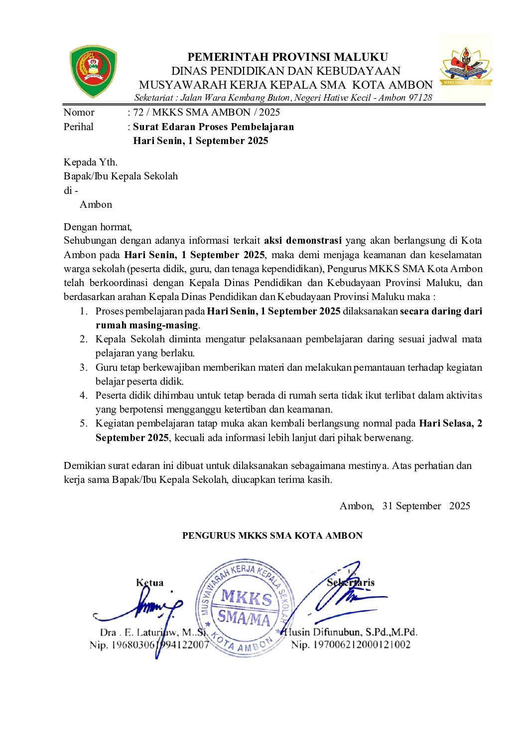 Demi menjaga keamanan dan keselamatan peserta didik, guru, dan tenaga kependidikan maka MKKS telah berkoordinasi dengan Kepala Dinas Pendidikan dan Kebudayaan Provinsi Maluku, dan sesuai arahan, maka proses pembelajaran pada tanggal 1 September 2025 dilaksanakan secara daring dari rumah masing-masing.