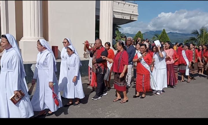 Mereka berarak sambil menari tradisional Toreh, khas Tanimbar Kabupaten Kepulauan Tanimbar (KKT) diikuti oleh ratusan umat paroki Santa Maria Bintang Laut Benteng Ambon.