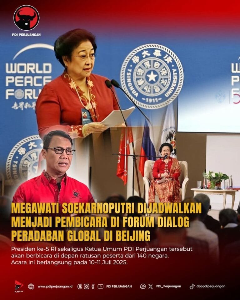 Presiden ke-5 RI sekaligus Ketua Umum PDI Perjuangan, Megawati Soekarnoputri dijadwalkan menjadi Pembicara di Forum Dialog Peradaban Global di Beijing.