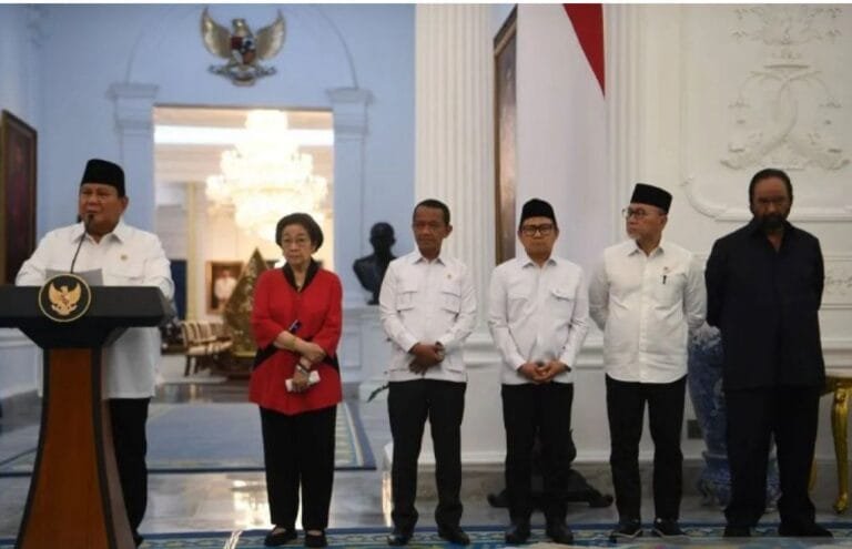 Dalam pernyataan resminya, Prabowo didampingi Presiden RI ke-5 Megawati Soekarnoputri, Ketua MPR Ahmad Muzani, Ketua DPR RI Puan Maharani, Ketua DPD RI Sultan Najamudin, serta sejumlah pimpinan partai politik, antara lain Wakil Ketua Umum Demokrat Edhie Baskoro Yudhoyono (Ibas), Sekjen PKS Muhammad Khalid, Ketua Umum Partai Golkar Bahlil Lahadalia, Ketua Umum PKB Muhaimin Iskandar, Ketua Umum PAN Zulkifli Hasan, dan Ketua Umum Partai NasDem Surya Paloh.