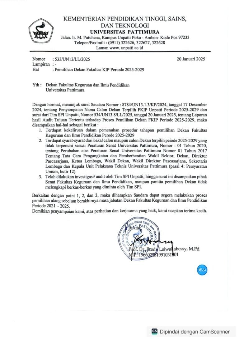 Surat yang ditujukan kepada Dekan FKIP Unpatti terdapat tiga point penting yang menjelaskan bahwa dari hasil audit proses pemilihan Dekan FKIP periode 2025-2029 selain terdapat kekeliruan dalam pemenuhan proses tahapan pemilihan, juga terdapat syarat-syarat dari bakal calon maupun calon Dekan terpilih periode 2025-2029 yang tidak terpenuhi sesuai Peraturan Senat Universitas Pattimura, Nomor : 01 Tahun 2020, tentang Perubahan atas Peraturan Senat Universitas Pattimura Nomor 01 Tahun 2017 Tentang Tata Cara Pengangkatan dan Pemberhentian Wakil Rektor, Dekan, Direktur Pascasarjana, Ketua Lembaga, Wakil Dekan, Wakil Direktur Pascasarjana, Sekretaris Lembaga dan Kepala Unit Pelaksana Teknis Universitas Pattimura (pasal 4: Persyaratan Umum, butir 12).
