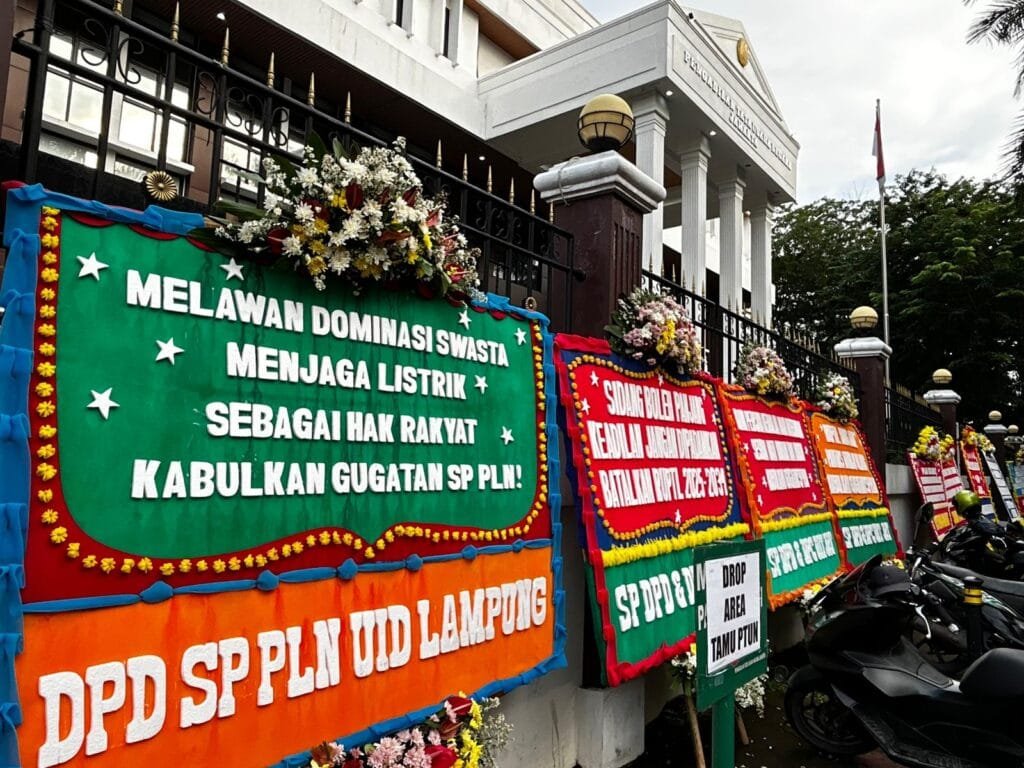 Sejak pagi hari, kawasan PTUN Jakarta dipenuhi warna merah dari ratusan anggota SP PLN yang datang dari berbagai daerah. Kehadiran mereka menciptakan suasana solidaritas yang kuat sekaligus menjadi simbol dukungan terhadap proses hukum yang sedang berjalan. Tidak hanya itu, area sekitar pengadilan juga tampak dibanjiri karangan bunga berisi pesan harapan agar keadilan ditegakkan dalam perkara tersebut.