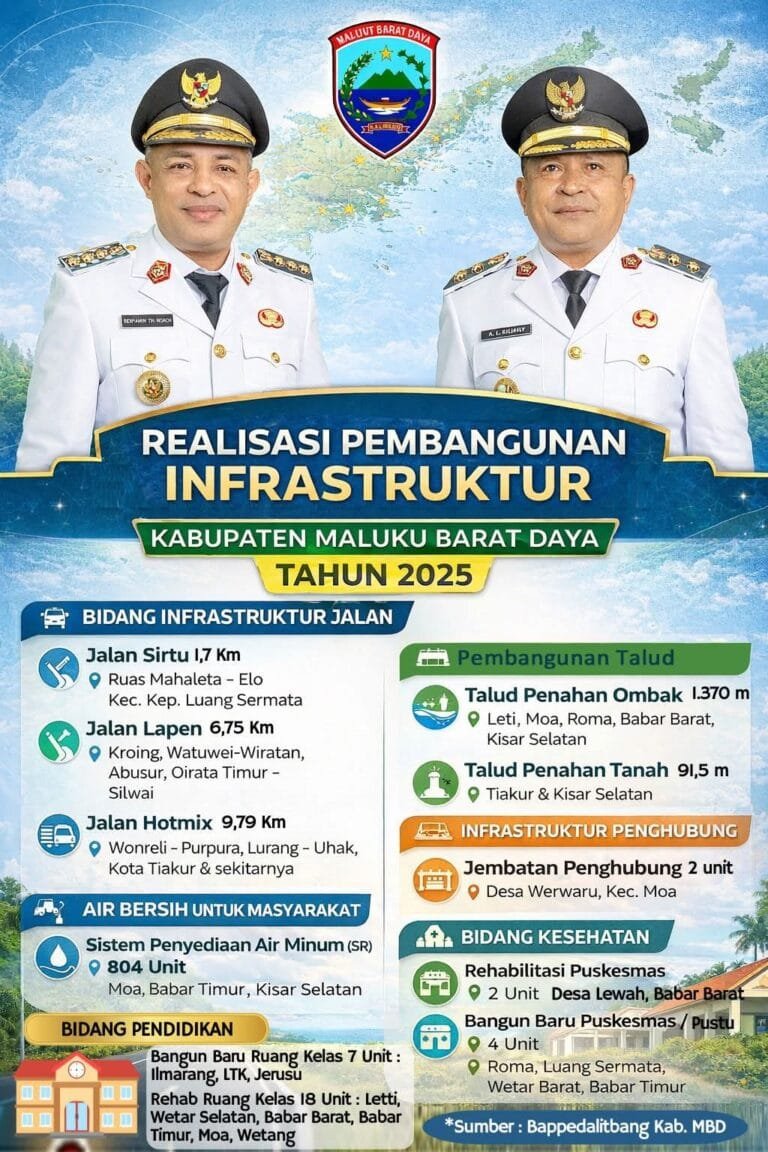 AMBON, LaskarMaluku.com – Satu tahun kepemimpinan Bupati Maluku Barat Daya Benyamin Thomas Noach dan Wakil Bupati Agustinus Lekwardai Kilikily ditengah efisiensi anggaran, berhasil membangun sejumlah infrastruktur dasar yang sudah dinikmati warga di bumi Kalwedo di tahun 2025 lalu.