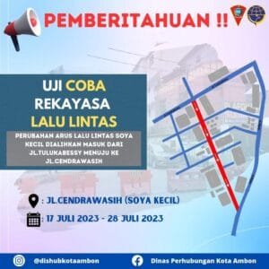 AMBON, LaskarMaluku.com – Dinas Perhubungan (Dishub) Kota Ambon akan melakukan Uji Coba Rekayasa Jalur Lalu Lintas mulai Senin (17/7/23) depan. Kepala Dishub (Kadishub) Kota, Robby Sapulette kepada Tim Media Center, Sabtu (15/7/23) di Ambon, menjelaskan, uji coba tersebut dilakukan untuk mengurai kemacetan yang biasa terjadi di Jalan Tulukabessy pada jam puncak. Rekayasa jalur tersebut yakni, […]
