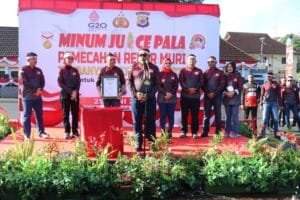 Kepolisian Daerah (Polda) Maluku mencetak sejarah baru, memecah Rekor MURI dengan minum jus pala sebanyaak 16.076 botol yang dilakukan dalam rangka memeriahkan HUT Bhayangkara ke-76, Sabtu (25/6/2022) di Lapangan Tahapary, Polda Maluku, Tantui Kota Ambon.