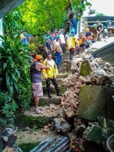 BPBD Kota Ambon, bersama Taruna Siaga Bencana (Tagana) dibantu Satuan Polisi Pamong Praja (Satpol PP) dan warga, Rabu (22/6/2022) bahu-membahu membersihkan material tanah longsor di RT 003/ RW 004 dan Talud Patah di RT 004/RW 007 Kelurahan Batu Meja, Kecamatan Sirimau, Kota Ambon.