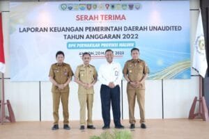 Wakil Gubernur Maluku, Barnabas Nathaniel Orno, menyerahkan Laporan Keuangan (LK) Unaudited TA 2022 Pemerintah Provinsi Maluku kepada Badan Pemeriksa Keuangan (BPK) Perwakilan Provinsi Maluku bertempat di Kantor BPK Perwakilan Provinsi Maluku, Senin (20/3/2023). Laporan Keuangan tersebut diterima langsung Kepala BPK Perwakilan Maluku, Yunaedi.