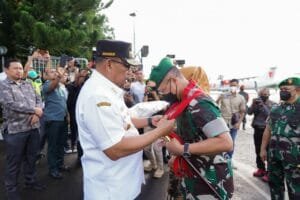 Gubernur Maluku Murad Ismail didampingi Ibu Widya Pratiwi Murad menyambut Panglima Komando Daerah Militer (Pangdam) XVI/Pattimura yang baru , Mayjen TNI. Ruruh Setyawibawa, di Bandara Internasional Pattimura, Ambon
