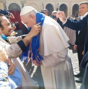 RD Paul Kalkoy mengalungkan Kain Tenun Tanimbar kepada pemimpin umat Katolik sedunia, Paus Fransiskus saat audiens di Basilika Santo Petrus Vatikan, Roma-Italia, Rabu (26/5/21). (Pau AS Kalkoy).