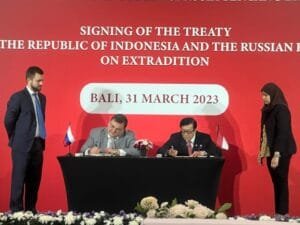 Menteri Hukum dan Hak Asasi Manusia (Menkumham), Yasonna H. Laoly, bersama Menteri Hukum Federasi Rusia, Konstantin Chuichenko menandatangani perjanjian ekstradisi antara Republik Indonesia (RI) dengan Federasi Rusia di Bali, Jumat (31/03/2023)