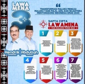 AMBON, LaskarMaluku.com – Pasangan Calon Gubernbur –Wakil Gubernur Maluku, Hendrik Lewerissa – Abdullah Vanath (LAWAMENA) mengusung tujuh program unggulan yang akan ditawarkan kepada masyarakat Maluku menuju Pilkada Maluku yang akan berlangsung pada 27 November 2024. Tujuh program unggulan ini diberinama ‘Sapta Cipta Lawamena’ yang dinilai akan mampu membawa Maluku lebih maju kedepan sebagai daerah dengan […]