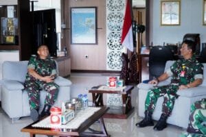 Pangdam XVI/ Pattimura, Mayjen TNI Ruruh A. Setyawibawa, S.E., M.M. menerima kunjungan Danlanud Pattimura, Kolonel Pnb Tiopan Hutapea di ruang kerja Pangdam, Senin (3/10/2022).