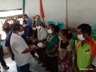 | Bupati KKT Petrus Fatlolon, SH,MH saat menyerahkan Bantuan Langsung Tunai di Desa Bomaki Kecamatan tanimbar Selatan, Kamis (07/05/2020) |