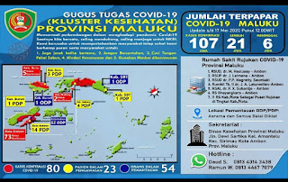 Dari data yang dirilis tim Gugus Tugas Percepatan Penanganan Covid 19 Provinsi Maluku, jumlah pasien kasus positif Covid-19 Provinsi Maluku bertambah 23 orang hinggaa total secara keseluruhan menjadi 107 orang, 21 telah dinyatakan sembuh dan 6 orang meninggal dunia, sementara 80 orang sementara menjalani perawatan di sejumlah rumah sakit.