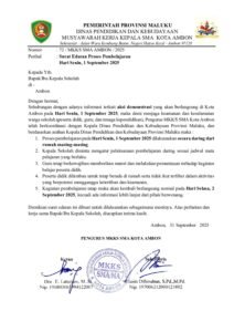 Musyawarah Kerja Kepala SMA Kota Ambon (MKKS) mengeluarkan surat edaran tentang proses pembelajaran yang ditujukan kepada bapak-ibu kepala sekolah, berkaitan dengan informasi aksi demonstrasi yang akan berlangsung di Kota Ambon, tanggal 1 September 2025.
