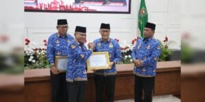Kepala BKN Zudan Arif Fakrulloh menyerahkan penghargaan kepada Pemerintah Kabupaten Maluku Barat Daya (MBD) yang diterima wakil bupati MBD Agustinus L. Kilikily di Kantor Gubernur Maluku, Selasa (8/7/2025).
